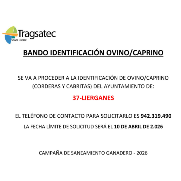 El Ayuntamiento de Liérganes informa a los ganaderos del municipio que se va a proceder a la identificación de ovino y caprino (corderas y cabritas) correspondiente a la Campaña de Saneamiento Ganadero 2026. Para solicitar la identificación, se deberá contactar a través del siguiente número de teléfono: 942 319 490. La fecha límite de solicitud…