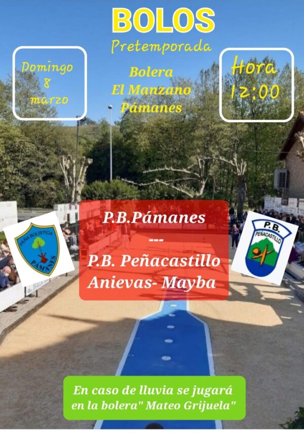 Este domingo 8 de marzo a las 12:00 h se disputará en la Bolera El Manzano el partido de pretemporada entre P.B. Pámanes y P.B. Peñacastillo Anievas–Mayba. Una buena oportunidad para disfrutar del deporte tradicional y animar a nuestros jugadores.👉 En caso de lluvia, el encuentro se celebrará en la bolera “Mateo Grijuela”. ¡Os esperamos!