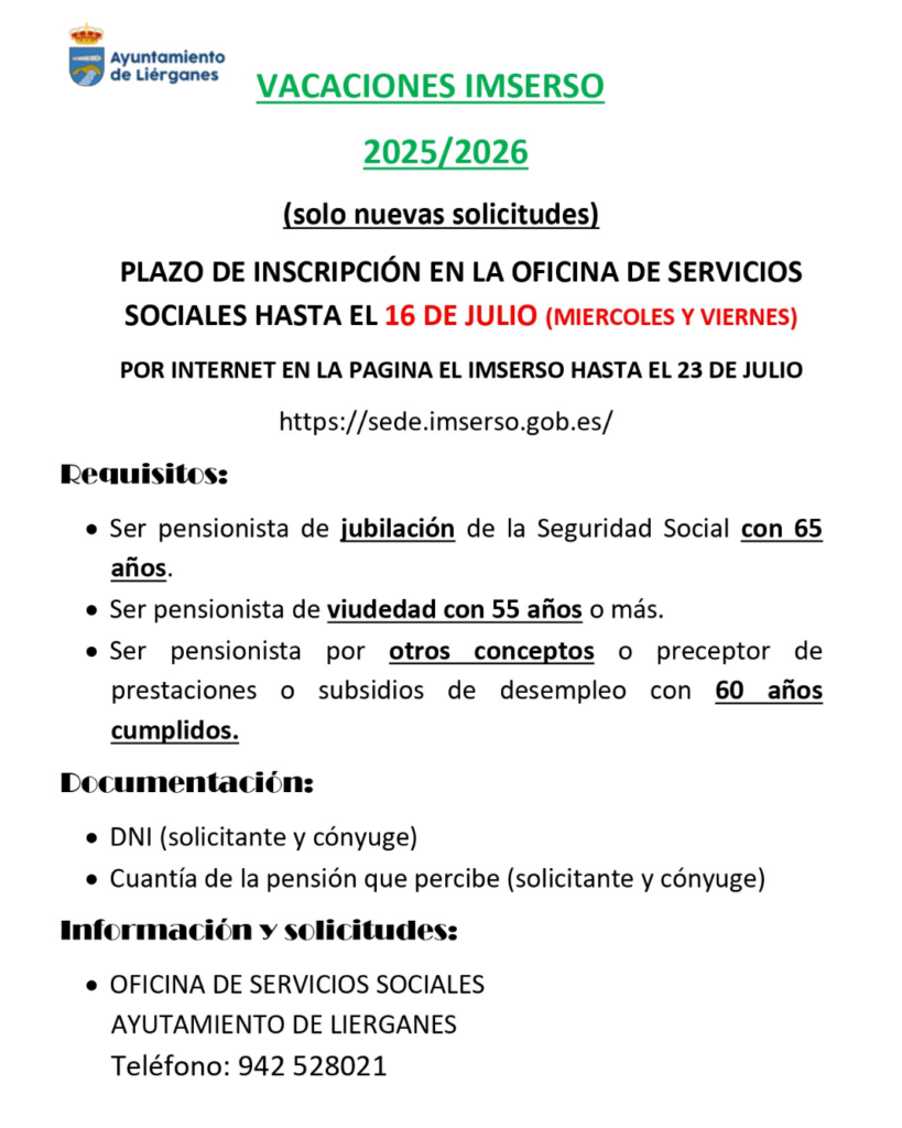 Ya está abierto el plazo de inscripción para participar en el Programa de Turismo del IMSERSO correspondiente a la temporada 2025-2026. Inscripción presencial: en las oficinas de Servicios Sociales, hasta el 16 de julio, en horario de atención los miércoles y viernes. Inscripción online: a través de: https://sede.imserso.gob.es/ hasta el 23 de julio.