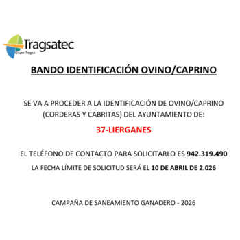 El Ayuntamiento de Liérganes informa a los ganaderos del municipio que se va a proceder a la identificación de ovino y caprino (corderas y cabritas) correspondiente a la Campaña de Saneamiento Ganadero 2026. Para solicitar la identificación, se deberá contactar a través del siguiente número de teléfono: 942 319 490. La fecha límite de solicitud…