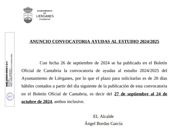 El Ayuntamiento de Liérganes, pone a disposición de las familias el servicio de conciliación durante el próximo periodo no lectivo, los días 28, 29, 30 y 31 de octubre en el CEIP Eugenio Perojo. Para niños de 3 a 12 años, preferencia a empadronados en el municipio. Inscripciones en el Ayuntamiento de 9:30 a 13:30Hasta…