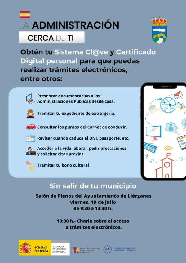 Obtén tu Sistema Cl@ve y Certificado Digital personal para que puedas realizar trámites electrónicos ahorrando tiempo, desplazamientos y de forma segura. Salón de Plenos del Ayuntamiento de Liérganesviernes, 19 de julio de 9:30 a 13:30 h. · 10:00 h. Charla sobre el acceso a trámites electrónicos.