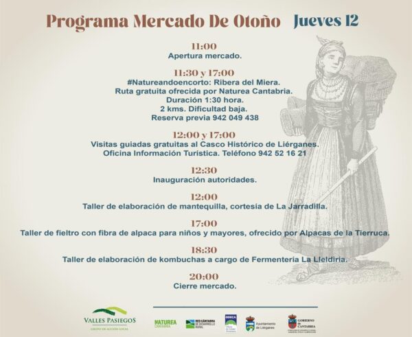 Los próximos 12, 13 y 14 de octubre tiene lugar en Liérganes el tradicional Mercado de Otoño de los Valles Pasiegos. Aquí os dejamos el programa con todas las actividades paralelas previstas. jueves 12 11:00 Apertura Mercado. 11:30 y 17:00 #Natureandoencorto: Ribera del Miera. Ruta gratuita ofrecida por Naturea Cantabria. Duración 1:30 horas, 2kms y…