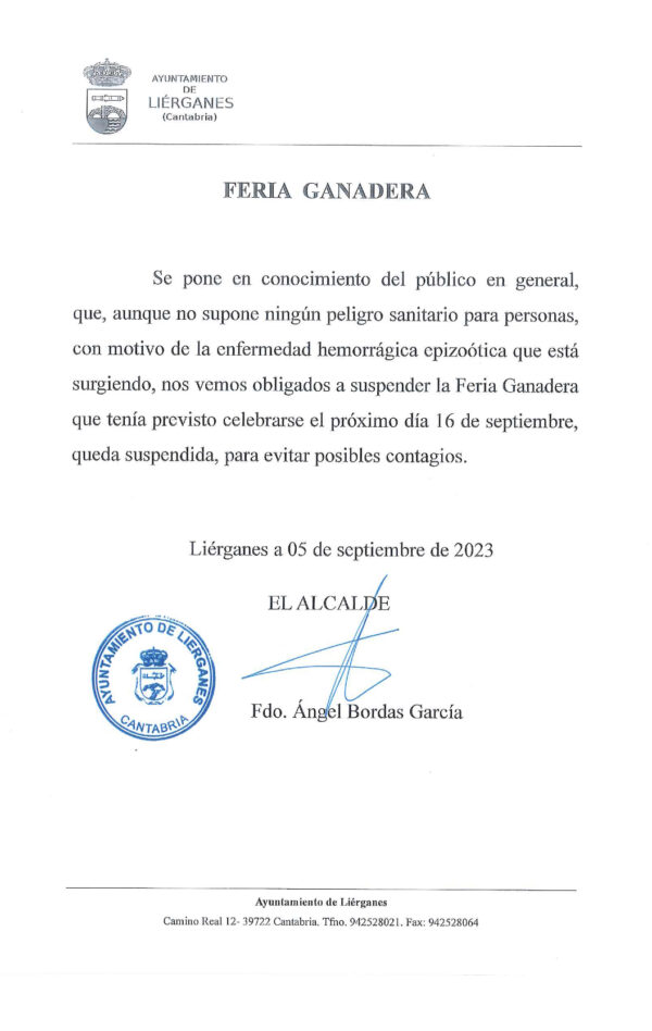 Aunque no supone ningún riesgo sanitario para las personas, ante la enfermedad hemorrágica epizoótica, que está surgiendo, nos vemos obligados a suspender la Feria ganadera que tenía prevista su celebración el próximo 16 de septiembre.
