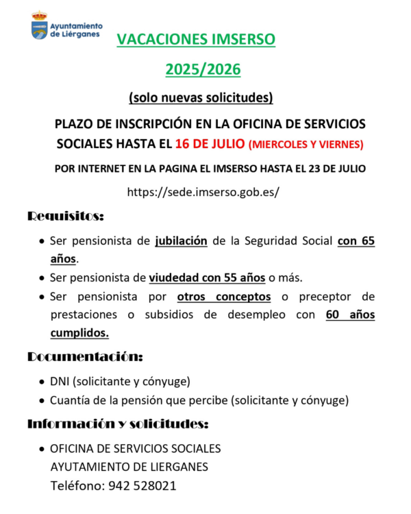 Ya está abierto el plazo de inscripción para participar en el Programa de Turismo del IMSERSO correspondiente a la temporada 2025-2026. Inscripción presencial: en las oficinas de Servicios Sociales, hasta el 16 de julio, en horario de atención los miércoles y viernes. Inscripción online: a través de: https://sede.imserso.gob.es/ hasta el 23 de julio.