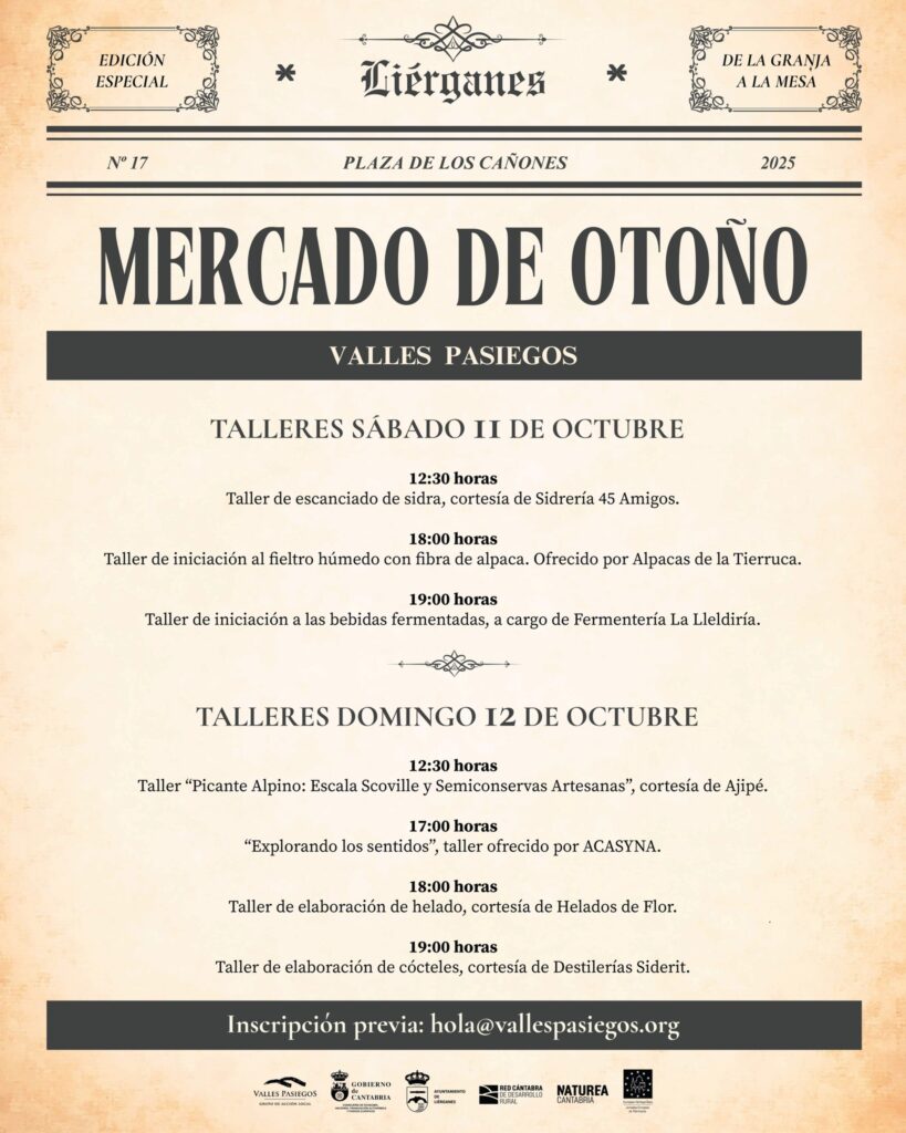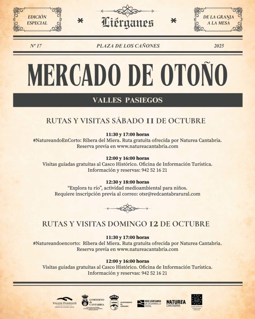 El Mercado de Otoño cuenta con la colaboración de Valles Pasiegos, Gobierno de Cantabria, Ayuntamiento de Liérganes, Red Cántabra de Desarrollo Rural y Naturea Cantabria.